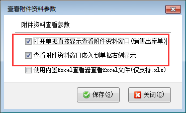 以銷售出庫單為例,在銷售出庫單界面工具欄點擊“附件資料”—》“查看附件資料參數(shù)”,可打開“查看附件資料參數(shù)”窗口,如下圖所示。