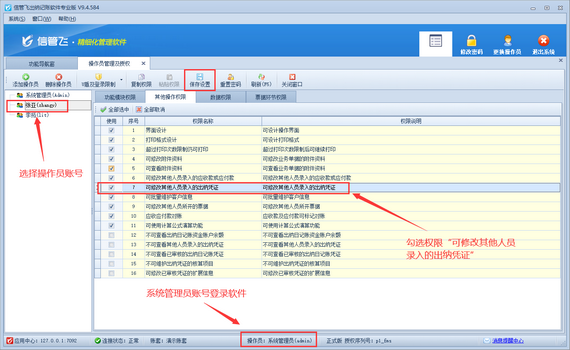 出現此問題的原因是:當前登錄的操作員賬號沒有修改其他人員錄入的出納憑證權限,解決方法如下:使用系統管理員賬號登錄軟件,在功能導航窗點擊“系統管理”—》“操作員及授權”打開操作員管理及授權界面,選擇操作員賬號,在“其他操作權限”界面將“可修改其他人員錄入的出納憑證”權限勾選上,然后保存權限設置,如下圖所示。