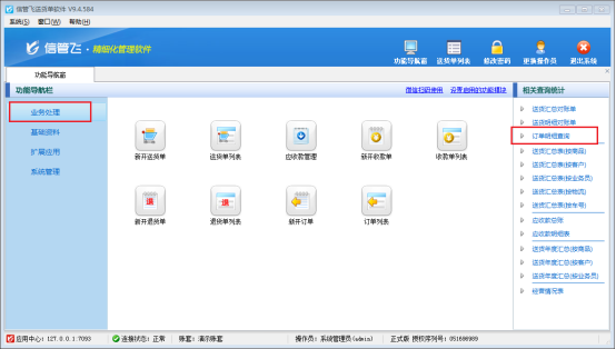在功能導(dǎo)航欄業(yè)務(wù)處理右側(cè)相關(guān)統(tǒng)計(jì)查詢(xún)下點(diǎn)擊“訂單明細(xì)查詢(xún)”,進(jìn)入訂單明細(xì)查詢(xún)界面,如圖所示: