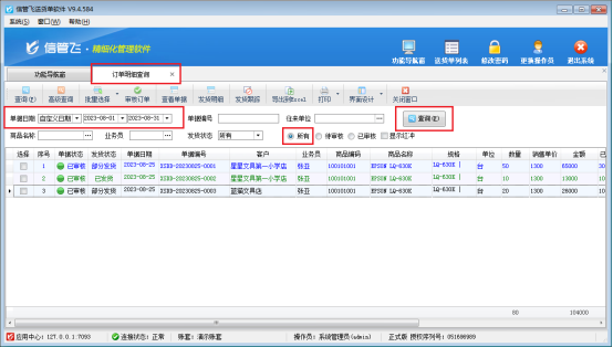 在訂單明細(xì)查詢(xún)界面支持自定義單據(jù)日期,比如需要導(dǎo)出8月份的訂單明細(xì),自定義單據(jù)日期設(shè)置為8月1---8月31日,點(diǎn)擊查詢(xún),顯示的結(jié)果是8月份所有的訂單明細(xì),如圖所示: