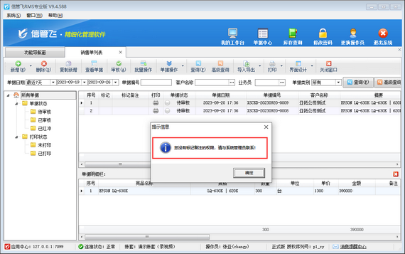 信管飛RMS支持對銷售單列表、采購單列表、銷售訂單列表以及采購訂單列表等標記備注,有用戶在標記單據備注時無法標記,系統彈出提示信息“您沒有標記備注的權限,請與系統管理員聯系!”如下圖所示: