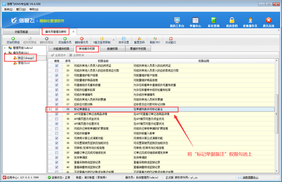 出現此問題的原因是:當前登錄的操作員賬號沒有標記單據備注權限,解決方法如下:使用系統管理員賬號登錄軟件,在功能導航窗點擊“系統管理”—》“操作員及授權”打開操作員管理及授權界面,選擇操作員賬號,在“其他操作權限”界面將“標記單據備注”權限勾選上,然后保存權限設置,如下圖所示。