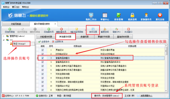 出現此問題的原因是:當前登錄的操作員沒有查看商品銷售價權限,解決方法如下:使用系統管理員賬號登錄軟件,在功能導航窗點擊“系統管理”—》“操作員及授權”打開操作員管理及授權界面,選擇操作員賬號,在“其他操作權限”界面將“查看商品銷售價”權限勾選上,然后保存權限設置,如圖所示: