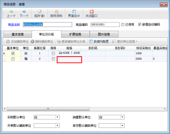 功能導航窗點擊“基礎資料”—“商品信息”點擊修改按鈕,在單位及價格界面進行添加輔助單位,輔助單位規格默認為空顯示,如下圖所示: