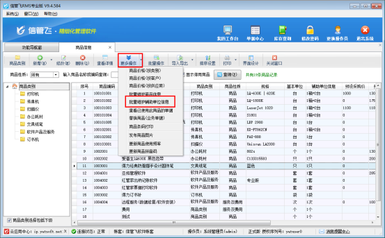 在商品信息界面,點擊工具欄“更多操作”下的“批量維護輔助單位信息”,可進入批量維護輔助單位界面。如下圖所示: