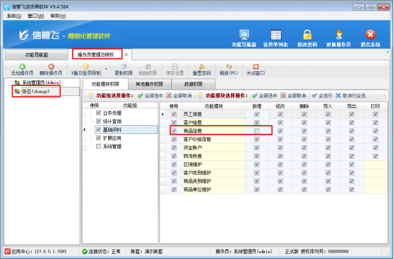 本文以“信管飛送貨單軟件”為例進(jìn)行示范,在功能導(dǎo)航窗點(diǎn)擊“系統(tǒng)管理”—“操作員及授權(quán)”,設(shè)置操作員“張亞”基礎(chǔ)資料商品信息取消新增權(quán)限,如下圖所示: