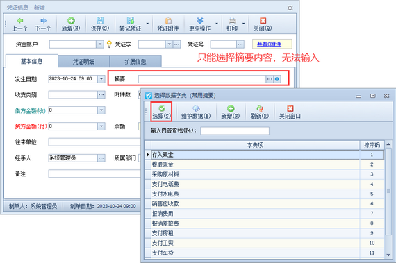 登記出納憑證時默認(rèn)可以直接輸入摘要內(nèi)容,有用戶在登記出納憑證時,可以選擇摘要,但是無法輸入摘要內(nèi)容,如下圖所示,本篇文章介紹一下解決方法。