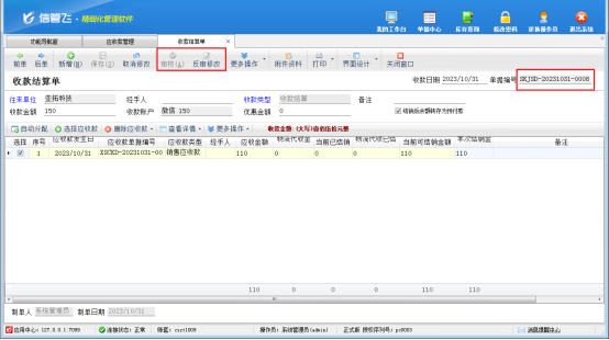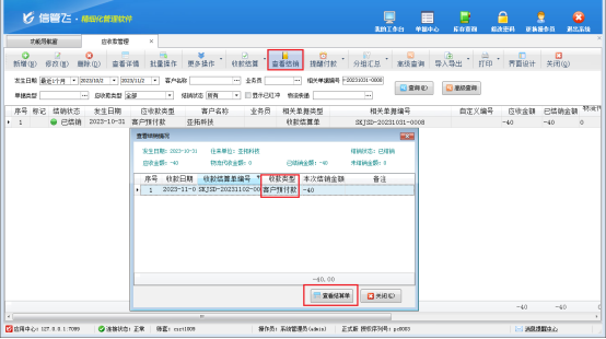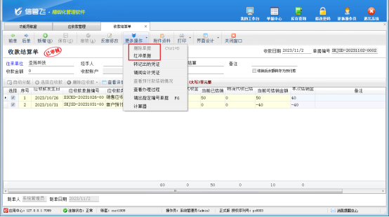 然后,選中此已結(jié)銷的客戶預(yù)付款記錄,在工具欄點(diǎn)擊“查看結(jié)銷”—》“查看結(jié)算單”,打開此客戶預(yù)付款的結(jié)銷記錄,更多操作下將此客戶預(yù)付款結(jié)銷記錄先紅沖后刪除,此時(shí)單據(jù)編號為“SKJSD-20231031-0008”的收款結(jié)算單即可反審修改成功,如下圖所示。
