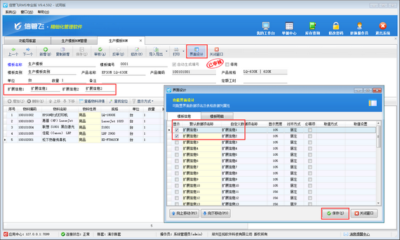 設(shè)置完成后,在功能導(dǎo)航窗點(diǎn)擊“生產(chǎn)管理”—》“生產(chǎn)模板BOM”打開生產(chǎn)模板Bom管理界面,新增生產(chǎn)模板,在打開的生產(chǎn)模板界面工具欄點(diǎn)擊“界面設(shè)計(jì)”—》“模板信息”,可將“擴(kuò)展信息1、擴(kuò)展信息2”勾選顯示出來并錄入相應(yīng)內(nèi)容,如下圖所示。