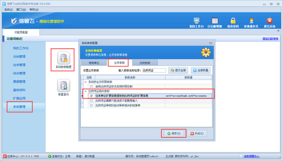 在功能導航窗點擊“系統管理”—》“系統參數配置”—》“業務參數”打開業務參數配置界面,然后在出納憑證相關參數中打鉤啟用“往來單位擴展信息提取到出納憑證的擴展信息”參數,參數值輸入相應提取的數據項名稱,如提取往來單位的開戶銀行和銀行賬號信息到出納憑證的擴展信息1和擴展信息2內顯示,則需要輸入“ext1=accountbank,ext2=accountno”,用英文的逗號間隔,然后點擊“保存”按鈕保存參數配置,如下圖所示。