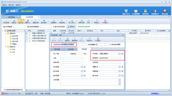 設置完成后,在功能導航窗點擊“基礎資料”—》“供應商信息”打開供應商管理界面,選擇一個供應商,修改供應商開戶銀行和銀行賬號信息,如下圖所示。