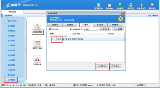 在功能導(dǎo)航窗點(diǎn)擊“系統(tǒng)管理”—》“系統(tǒng)參數(shù)配置”—》“業(yè)務(wù)參數(shù)”可以打開(kāi)“業(yè)務(wù)參數(shù)”配置界面,在業(yè)務(wù)單據(jù)相關(guān)參數(shù)內(nèi)取消勾選“已發(fā)貨的訂單不可修改不可紅沖”參數(shù),然后點(diǎn)擊“保存”按鈕保存設(shè)置,如圖所示。