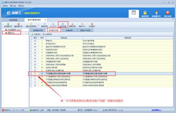 解決方法如下:使用系統管理員賬號登錄軟件,在功能導航窗點擊“系統管理”—》“操作員及授權”打開操作員管理及授權界面,選擇操作員賬號,在“其他操作權限”界面將“不可查看出納日記賬資金賬戶余額”權限勾選取消,然后保存權限設置,如下圖所示: