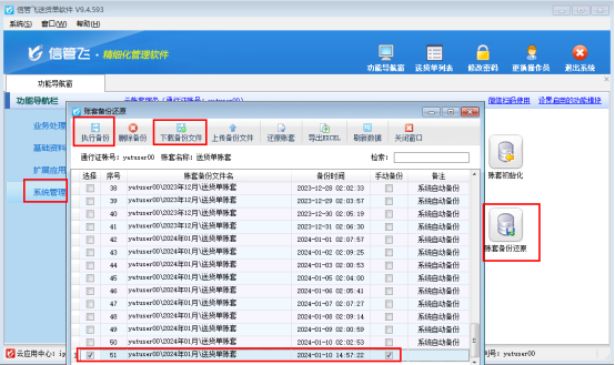 云賬套版本初始化后會清除之前所有數據,需要初始化前保留之前備份數據,可以在系統管理—“賬套備份還原”中,先手動執行備份,備份執行完成后選擇備份文件點擊“下載備份文件”到本地,如下圖所示: