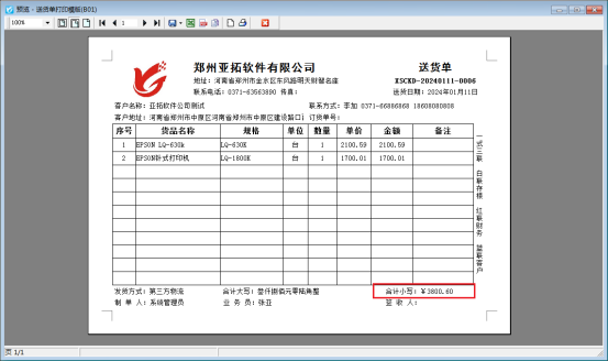 本文以“信管飛送貨單軟件”為例,示范下打印模板如何設置金額取整顯示并且不進行四舍五入,新開一個送貨單,金額存在小數,打印預覽圖如下: