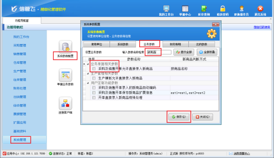 在功能導航窗點擊“系統管理”—》“系統參數配置”—》“業務參數”,即可進入到“業務參數”配置界面,在業務單據相關參數內取消勾選采購及銷售開單允許直接錄入新商品”參數,然后點擊“保存”按鈕保存設置,如下圖所示: