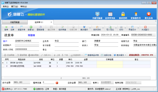 本文以“信管飛送貨單軟件”為例,示范下打印模板如何設(shè)置金額四舍五入保留兩位小數(shù),打開一個(gè)送貨單,金額存在小數(shù),打印預(yù)覽圖如下: