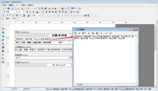 打印模板起始日期--截止日期,在查詢界面打印下點(diǎn)擊“打印格式設(shè)計(jì)”,選擇打印模板,點(diǎn)擊“設(shè)計(jì)格式”進(jìn)入模板設(shè)計(jì)器,打開金額文本框,復(fù)制調(diào)用數(shù)據(jù)項(xiàng):[查詢條件."起始日期" #Dyyyy]年第[查詢條件."起始日期" #Dmm]期 至 [查詢條件."截止日期" #Dyyyy]年第[查詢條件."截止日期" #Dmm]期,然后確認(rèn)保存,如下圖: