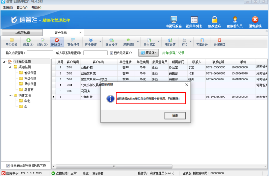 信管飛倉庫管理軟件信管飛送貨單軟件信管飛RMS軟件等都支持維護客戶信息,客戶信息支持開單直接新增和基礎資料中新增,有時開單直接新增導致出現客戶信息重復的現象,在客戶信息中刪除重復客戶名稱。會彈出提示“當前選擇的往來單位在業務單據中有使用,不能刪除!”本文以“送貨單軟件”為例,示范下如何刪除?