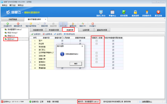 經檢查,出現此問題是因為操作員權限設置的數據權限影響,在系統管理-操作員及授權界面。選擇此操作員,打開數據權限,把只查看本人數據權限取消勾選,然后保存操作員權限,如下圖所示: