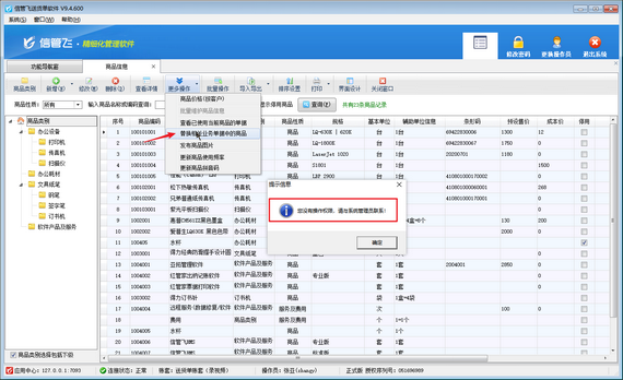 信管飛軟件支持設(shè)置多個(gè)操作員賬號(hào)并對(duì)操作員賬號(hào)設(shè)置權(quán)限,有用戶操作員賬號(hào)登錄送貨單軟件,在商品信息界面使用“替換相關(guān)業(yè)務(wù)單據(jù)中的商品”功能時(shí),系統(tǒng)會(huì)彈出提示信息“您沒有操作權(quán)限,請(qǐng)與系統(tǒng)管理員聯(lián)系!”,如下圖所示。
