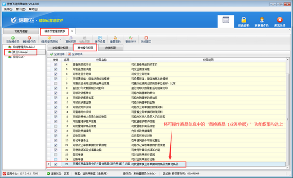 出現(xiàn)以上問題的原因是:操作員賬號(hào)沒有操作“替換商品(業(yè)務(wù)單據(jù))”功能的權(quán)限,解決方法如下:使用系統(tǒng)管理員賬號(hào)登錄軟件,在功能導(dǎo)航窗點(diǎn)擊“系統(tǒng)管理”—》“操作員及授權(quán)”打開操作員管理及授權(quán)界面,選擇操作員賬號(hào),在“其他操作權(quán)限”界面將“可操作商品信息中的‘替換商品(業(yè)務(wù)單據(jù))’功能”權(quán)限勾選上,然后保存權(quán)限設(shè)置,如下圖所示。