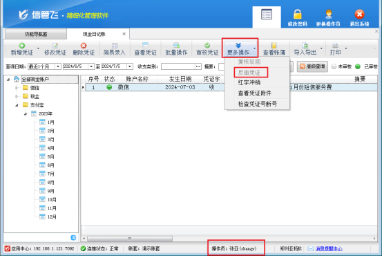 信管飛出納記賬軟件中支持反審憑證,憑證已審核后如發(fā)現(xiàn)填寫錯(cuò)誤,可以反審憑證,反審后,憑證狀態(tài)恢復(fù)為未審核狀態(tài),可以繼續(xù)對這個(gè)憑證進(jìn)行修改操作,然而,部分用戶反饋,在使用操作員賬號(hào)登錄時(shí),可能會(huì)遇到無法對已審核憑證執(zhí)行反審并修改的問題。切換系統(tǒng)管理員登錄,可以正常對憑證進(jìn)行修改,這是由于操作員沒有反審日記賬憑證導(dǎo)致的,本文以“信管飛出納記賬軟件”為例進(jìn)行示范。