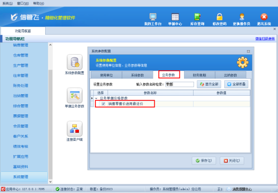 軟件中需要啟用下參數,在功能導航窗點擊“系統管理”打開“系統參數配置”,業務參數中啟用參數“銷售零售價啟用最近價”,并保存參數配置,如下圖所示: