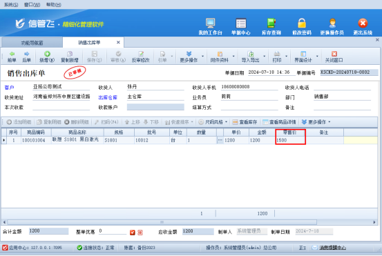 審核單據后,再次新增選擇相同客戶相同商品,零售價可看到默認取上次輸入的價格1500元,如下圖所示: