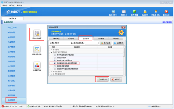 首先需要啟用基礎(chǔ)資料數(shù)據(jù)項(xiàng)權(quán)限控制參數(shù),在功能導(dǎo)航窗點(diǎn)擊“系統(tǒng)管理”—》“系統(tǒng)參數(shù)配置”—》“業(yè)務(wù)參數(shù)”打開業(yè)務(wù)參數(shù)配置界面,然后在系統(tǒng)安全及權(quán)限參數(shù)內(nèi)勾選啟用“啟用基礎(chǔ)資料數(shù)據(jù)項(xiàng)權(quán)限控制”參數(shù),然后點(diǎn)擊“保存”按鈕保存參數(shù)配置,如下圖所示。