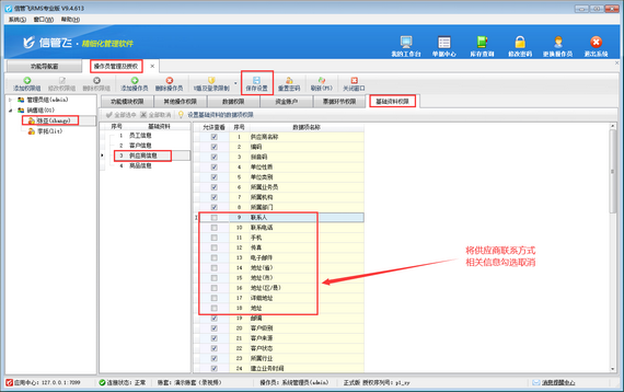 參數(shù)設(shè)置完成后,用系統(tǒng)管理員賬號(hào),在功能導(dǎo)航窗點(diǎn)擊“系統(tǒng)管理”—》“操作員及授權(quán)”打開操作員管理及授權(quán)界面,選擇操作員賬號(hào),然后在“基礎(chǔ)資料權(quán)限”界面將供應(yīng)商聯(lián)系方式相關(guān)信息勾選取消,如下圖所示。