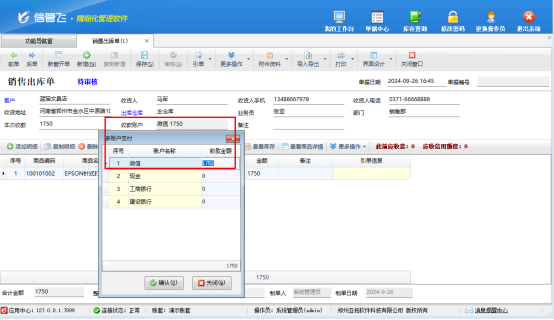 選擇客戶和商品開單,直接收款可直接輸入到本次收款中,收款賬戶默認取資金賬戶的默認賬戶。如有多個收款賬戶時,把應收金額輸入到收款賬戶中,本次收款金額會自動顯示,如下圖所示: