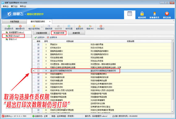 然后,在操作員權(quán)限管理中,取消操作員“超過打印次數(shù)限制仍可打印”的權(quán)限。