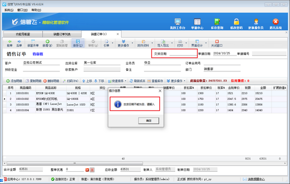 有用戶在使用信管飛軟件時,填開銷售訂單保存不成功,提示“交貨日期不能為空,請輸入”,訂單無法保存,如下圖所示。