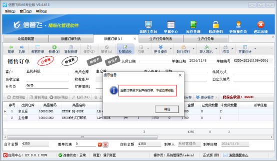 信管飛RMS軟件支持對銷售訂單進行反審修改、紅沖操作,部分用戶在修改已下達任務單的銷售訂單時可能會出現“當前訂單已下達任務,不能反審修改”的提示,本篇文章以“信管飛RMS軟件”為例介紹下已下達任務訂單無法修改如何解決?