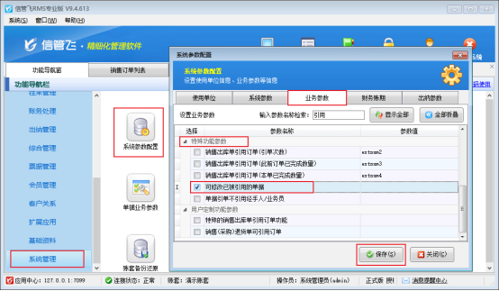 在功能導航窗點擊“系統管理”—》“系統參數配置”—》“業務參數”可以打開“業務參數”配置界面,在特殊功能參數內勾選“已修改已被引用的單據”參數,然后點擊“保存”按鈕保存設置,如圖所示。