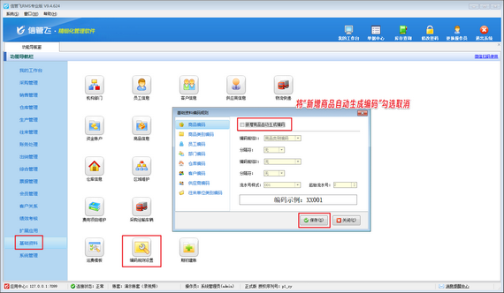 在功能導航窗點擊“基礎資料”—》“編碼規則設置”打開基礎資料編碼規則界面,將“新增商品自動生成編碼”勾選取消,然后保存編碼規則設置。