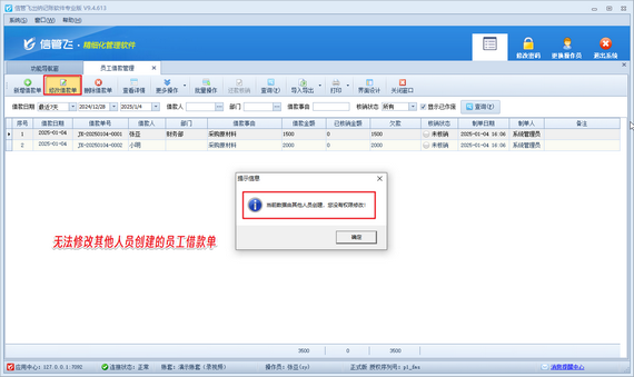出現以上問題的原因是:當前登錄的操作員賬號沒有可修改其他人員創建的員工借款單權限