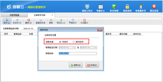 一鍵結存,賬期清晰:在“倉庫管理-庫存月結”界面點擊“結存”,選擇按月或跨月結賬類型,系統自動校驗賬期內單據狀態,確保所有業務數據已審核后完成結存。