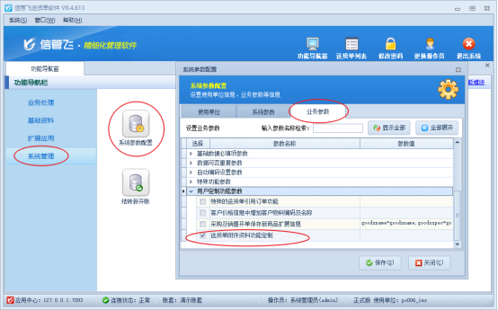 在功能導航窗點擊“系統管理”----“系統參數配置”----“業務參數”勾選送貨單附件資料功能定制,保存設置。如下圖所示:
