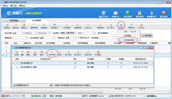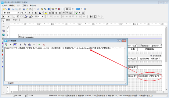 在應付款管理界面點擊打印---打印格式設計,選中模板點擊設計格式;進入模板設計器,雙擊擴展信息6對應合計的文本框,輸入計算公式:[SUM([IIF([應付款信息."擴展信息6"]=NULL,0,IIF([應付款信息."擴展信息6"]='',0,StrToFloat([應付款信息."擴展信息6"])))],,,)]