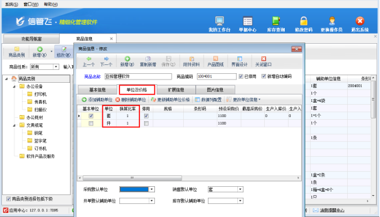功能導(dǎo)航窗點(diǎn)擊基礎(chǔ)資料,打開商品信息界面,選擇商品信息點(diǎn)擊“修改”按鈕,在單位及價(jià)格界面,添加輔助單位,設(shè)置換算比率為1:1,支持新增多個(gè)輔助單位。如下圖所示: