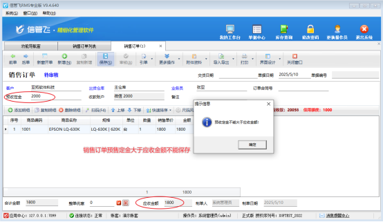 訂單中預收定金2000元,訂單應收金額1800元,開單不能保存。