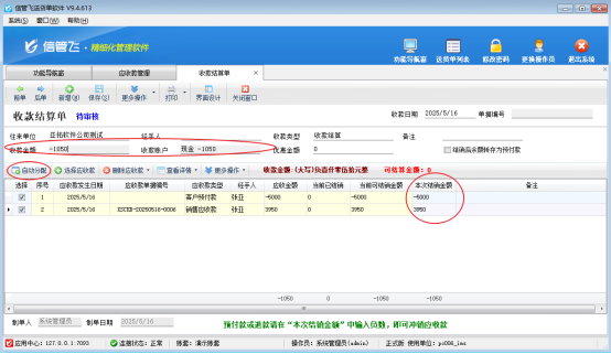 在應(yīng)收款管理界面點擊收款結(jié)算,進(jìn)入收款結(jié)算單單據(jù)界面,在該界面錄入收款金額和收款賬戶,客戶預(yù)付款和銷售應(yīng)收款抵消結(jié)算,多余預(yù)付退回,收款金額輸入負(fù)1050元,點擊自動分配,如圖