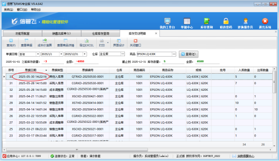 例如商品名稱“EPSON LQ-630K”,倉庫庫存數量是5個,出庫單開單界面點擊刷新庫存當前庫存數量是0,經檢查發現原因是該商品入庫單發生時間是5月30日14點22分,銷售單出庫時間是5月30日10點,如圖