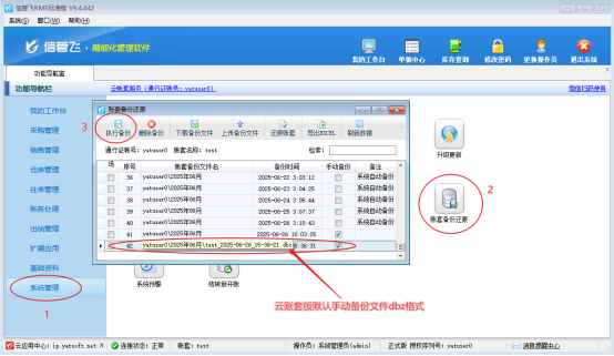 信管飛系列軟件包括信管飛RMS、信管飛倉庫管理軟件、信管飛送貨單軟件、信管飛出納記賬軟件等,均支持本地版和云賬套版本。軟件可以設置自動備份另外支持手動自行備份,本文以“信管飛RMS軟件”為例,云賬套版軟件備份賬套dbz格式如何還原數據。
