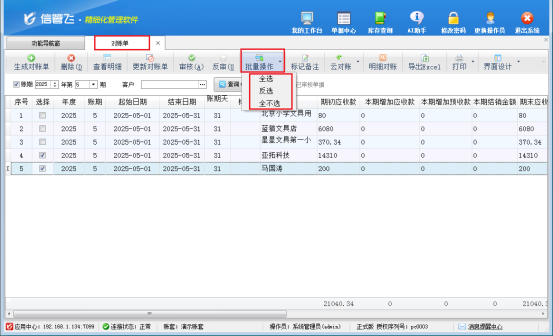 開啟批量操作模式:進入對賬單界面后,找到工具欄中的“批量操作”按鈕,輕輕一點,即可進入批量操作模式。在這個模式下,您可以自由選擇需要操作的對賬單,操作更加便捷高效。
