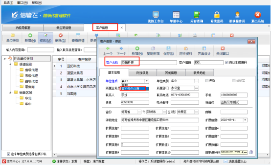 經(jīng)檢查,因此名稱(chēng)在客戶(hù)信息中已存在,如需要設(shè)置此單位名稱(chēng)既是客戶(hù)又是供應(yīng)商,可在客戶(hù)信息中找到此單位名稱(chēng),選擇并點(diǎn)擊修改按鈕,修改單位性質(zhì)為“客戶(hù)及供應(yīng)商”,如下圖所示: