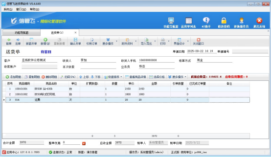 新開送貨單,添加商品明細中包含運費項:(EPSON LQ-630k)2150元+(EPSON針式打印機)1800元+(運費)20元=(合計金額)3970元,運費自動計入客戶應收款,可用于結銷客戶款項,如下圖所示: