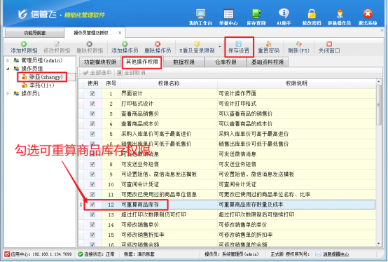 首先,使用系統管理員賬號登錄軟件,點擊功能導航窗,“系統管理”—》“操作員及授權”,進入操作員管理及授權界面中,選擇操作員賬號,進入“其他操作權限”界面,勾選“可重算商品庫存”權限,然后點擊保存設置。